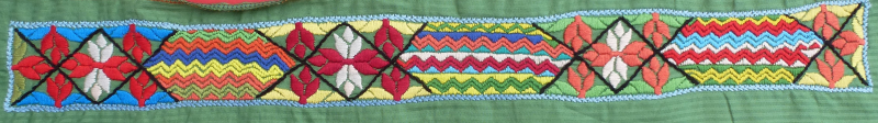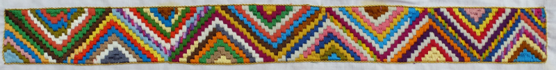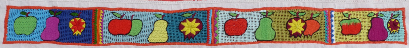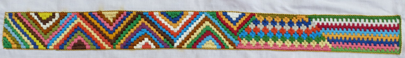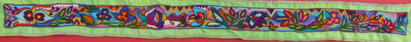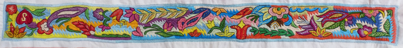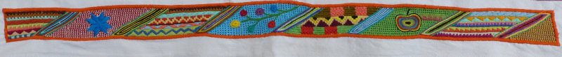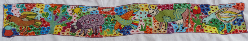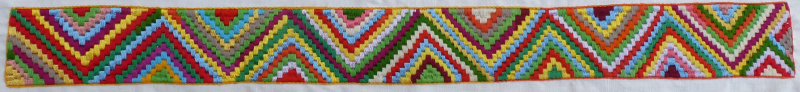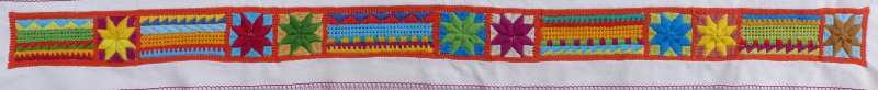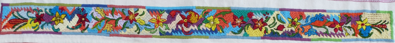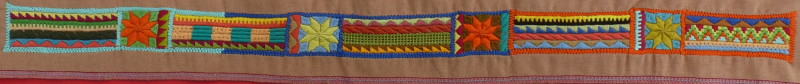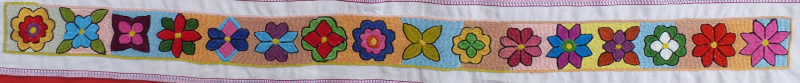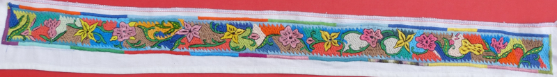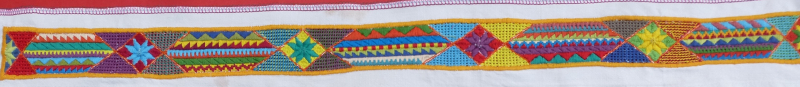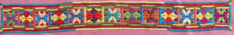 These ribbons weren’t originally ordered in this form. In 2011 some of the women had the idea to make use of the space that sometimes remained on their embroidered cloths, to create a ribbon. I found this a good idea, as the complete cloth is returned to us in any case.